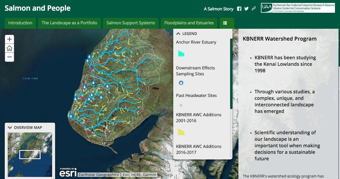 We also present the state of watershed research related to salmon with an interactive story map and short videos that help stakeholders understand how different landscape elements (i.e. alder, peat wetlands, and shallow groundwater flows) are essential for salmon success. The geospatial tool allows landowners and decision makers to view these elements within a geographic information system including land parcels, existing infrastructure, and waterways. Incorporating the geospatial tool into decision making allows stakeholders to pursue development in a way that maintains watershed connectivity and landscape elements that support salmon streams.